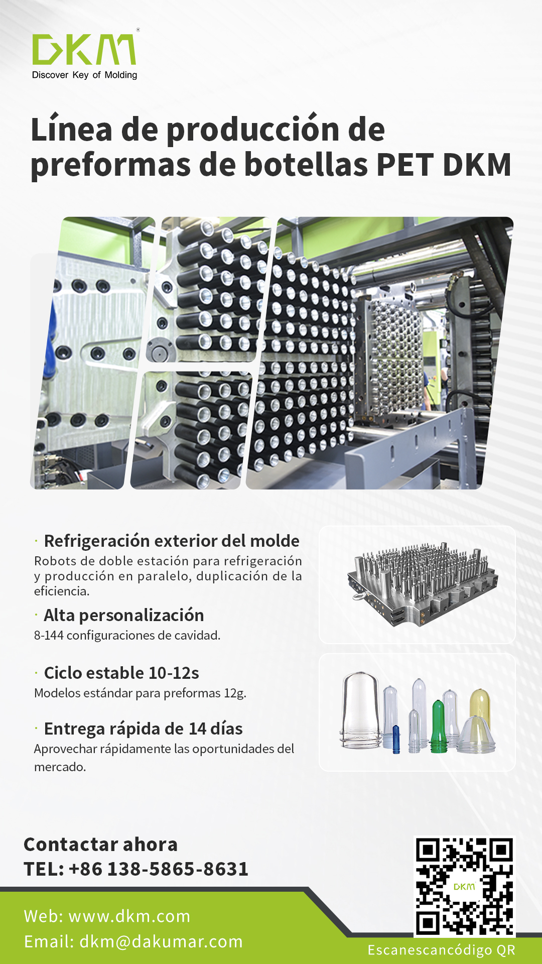 DKM se sitúa a la vanguardia de la tecnología de moldeo por inyección de preformas, ofreciendo soluciones de líneas de producción integradas reconocidas por su alta precisión, eficiencia excepcional y notable fiabilidad. Nuestra promesa central es entregar un sistema de alto rendimiento sin interrupciones —que abarca el molde de inyección de preformas, la máquina de inyección PET y el equipo auxiliar esencial— específicamente diseñado para producir preformas PET de alta calidad, con la ventaja distintiva de un período de entrega rápido de 2 semanas para preformas PET de cuello estándar de 48, 72 y 96 cavidades. Este artículo detalla las fortalezas clave que convierten a DKM en el socio óptimo para su éxito productivo.