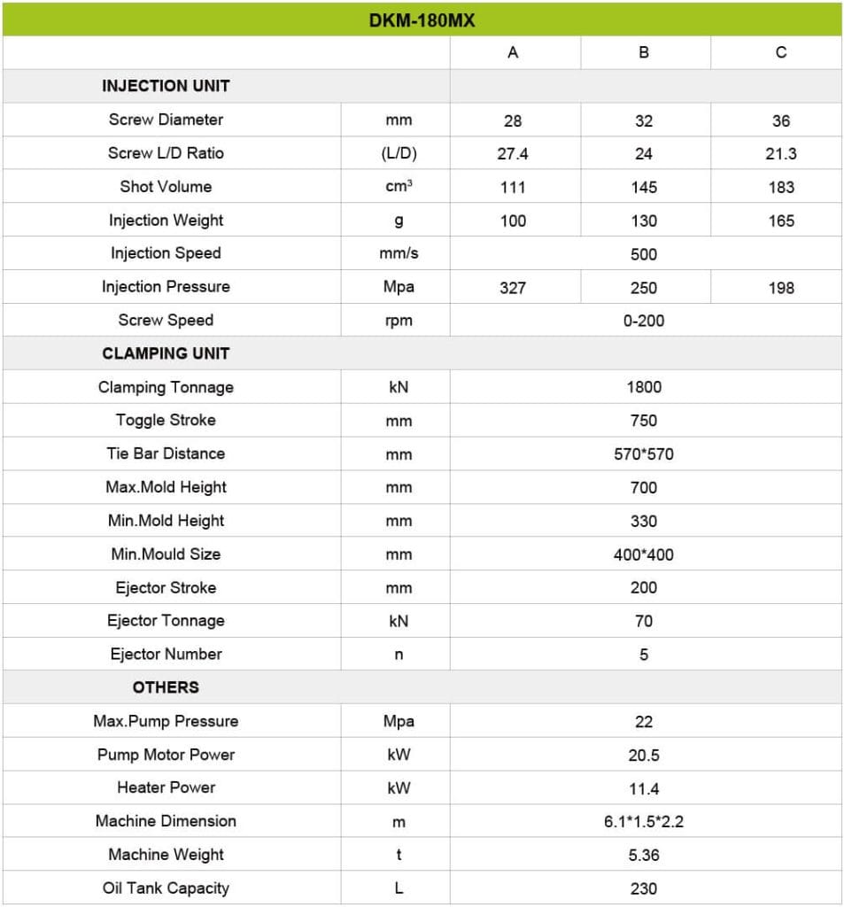 La precisión y la limpieza son cruciales en el campo de rápida evolución de la tecnología médica. Presentando la serie MX – DKM, una máquina de moldeo por inyección de plástico avanzada especialmente diseñada para aplicaciones médicas. Esta máquina avanzada está transformando el proceso de fabricación de dispositivos y componentes médicos. La 250Ton-DKM ofrece una gran precisión, velocidad y confiabilidad gracias a su tecnología de vanguardia y características distintivas. Al crear soluciones médicas de alta calidad, seguras y razonablemente asequibles, satisface las crecientes demandas de la industria de la salud.