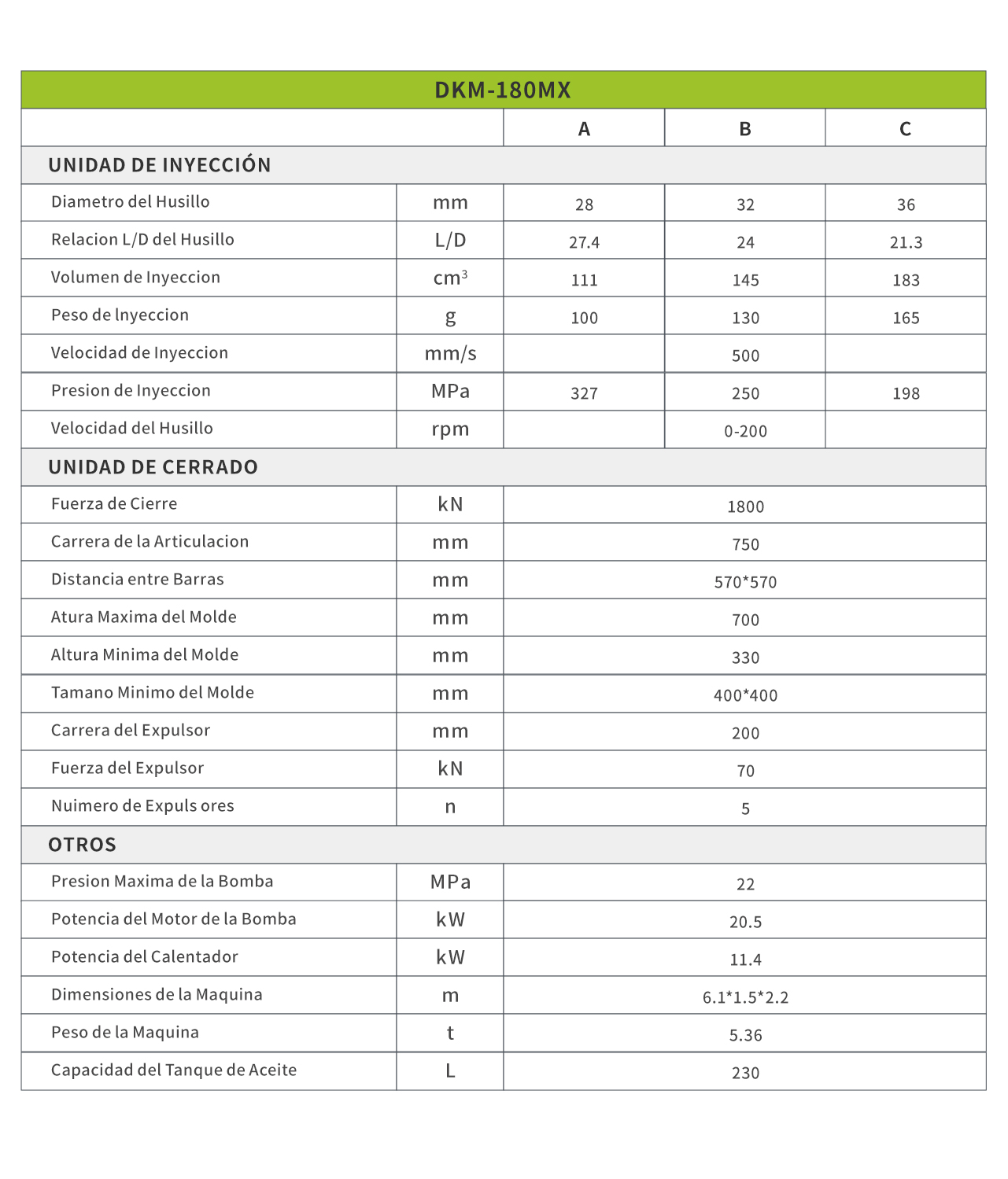 - Especificación de la Máquina de Moldeo por Inyección MX
